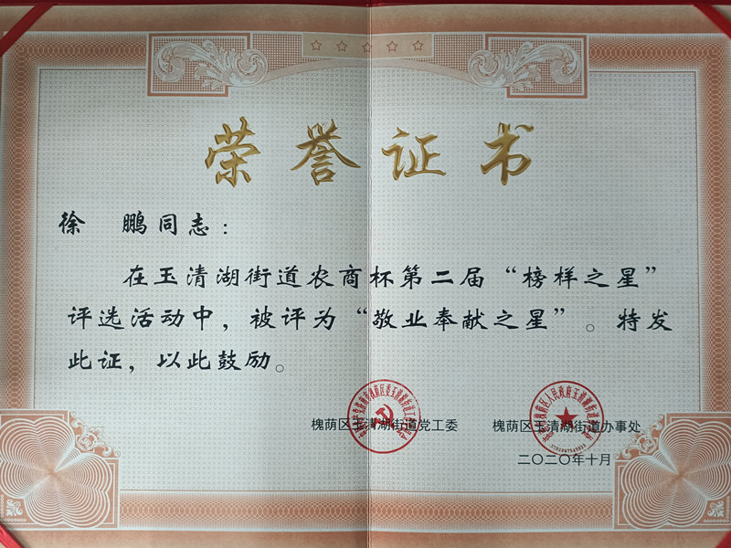 為進(jìn)一步培育和踐行社會(huì)主義價(jià)值觀,弘揚(yáng)正氣、傳承美德,發(fā)揮先進(jìn)典型在公民道德建設(shè)中的示范引領(lǐng)作用,濟(jì)南市槐蔭區(qū)玉清湖街道黨工委通過(guò)廣泛發(fā)動(dòng),經(jīng)過(guò)轄區(qū)、駐地企業(yè)的積極推薦和參選,我公司徐鵬總經(jīng)理在玉清湖街道農(nóng)商杯第二屆“榜樣之星”評(píng)選活動(dòng)中被評(píng)為“敬業(yè)奉獻(xiàn)之星”。