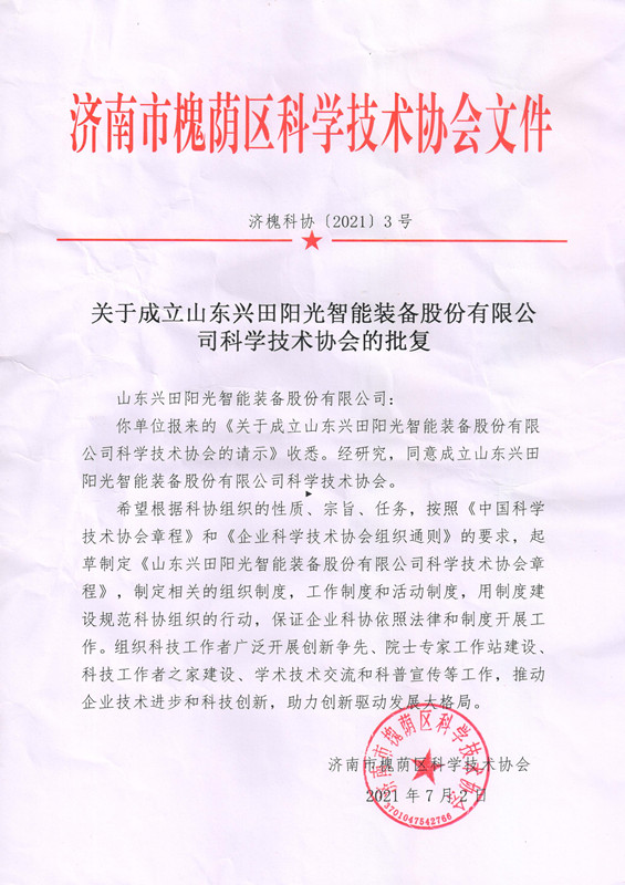 為充分發(fā)揮我公司科技人員的作用,團(tuán)結(jié)和動(dòng)員廣大科技人員圍繞公司的中心工作,推動(dòng)技術(shù)創(chuàng)新,促進(jìn)公司的經(jīng)濟(jì)發(fā)展,經(jīng)研究,我公司成立山東興田陽(yáng)光智能裝備股份有限公司科學(xué)技術(shù)協(xié)會(huì)。