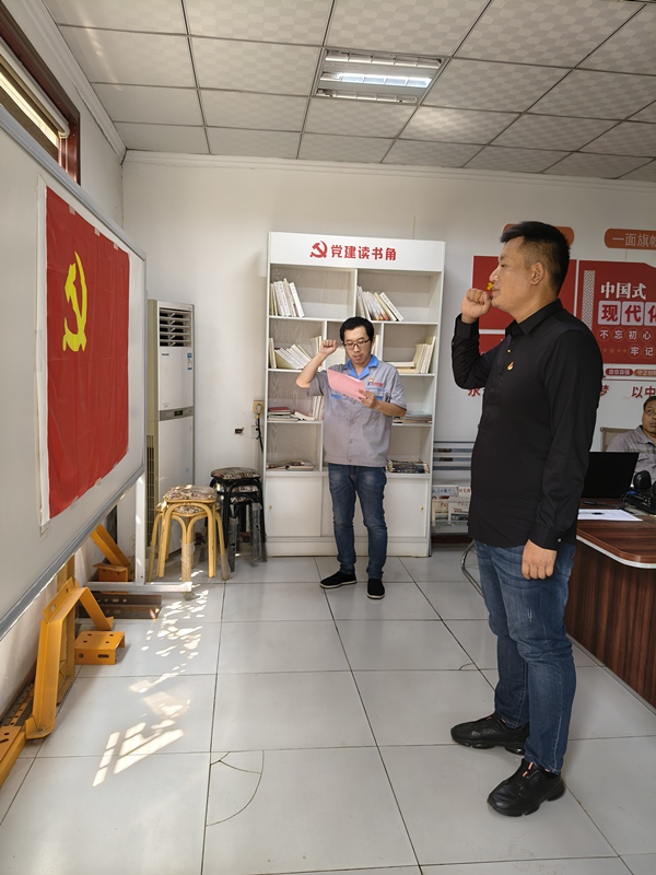會(huì)議最后,為新黨員舉行了入黨宣誓儀式,預(yù)備黨員邢方亮同志面對(duì)鮮紅的黨旗,在領(lǐng)誓人、支部書記王德華同志的帶領(lǐng)下莊嚴(yán)宣誓。