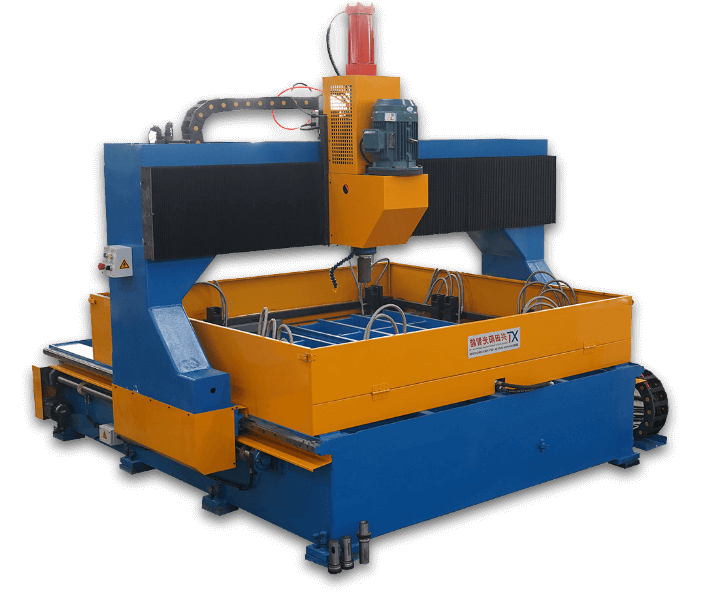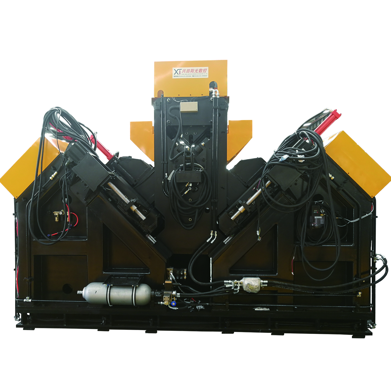 該機(jī)為龍門(mén)式五缸壓力機(jī),可利用前后管支架,對(duì)鋼管進(jìn)行矯直作業(yè),一機(jī)兩用。