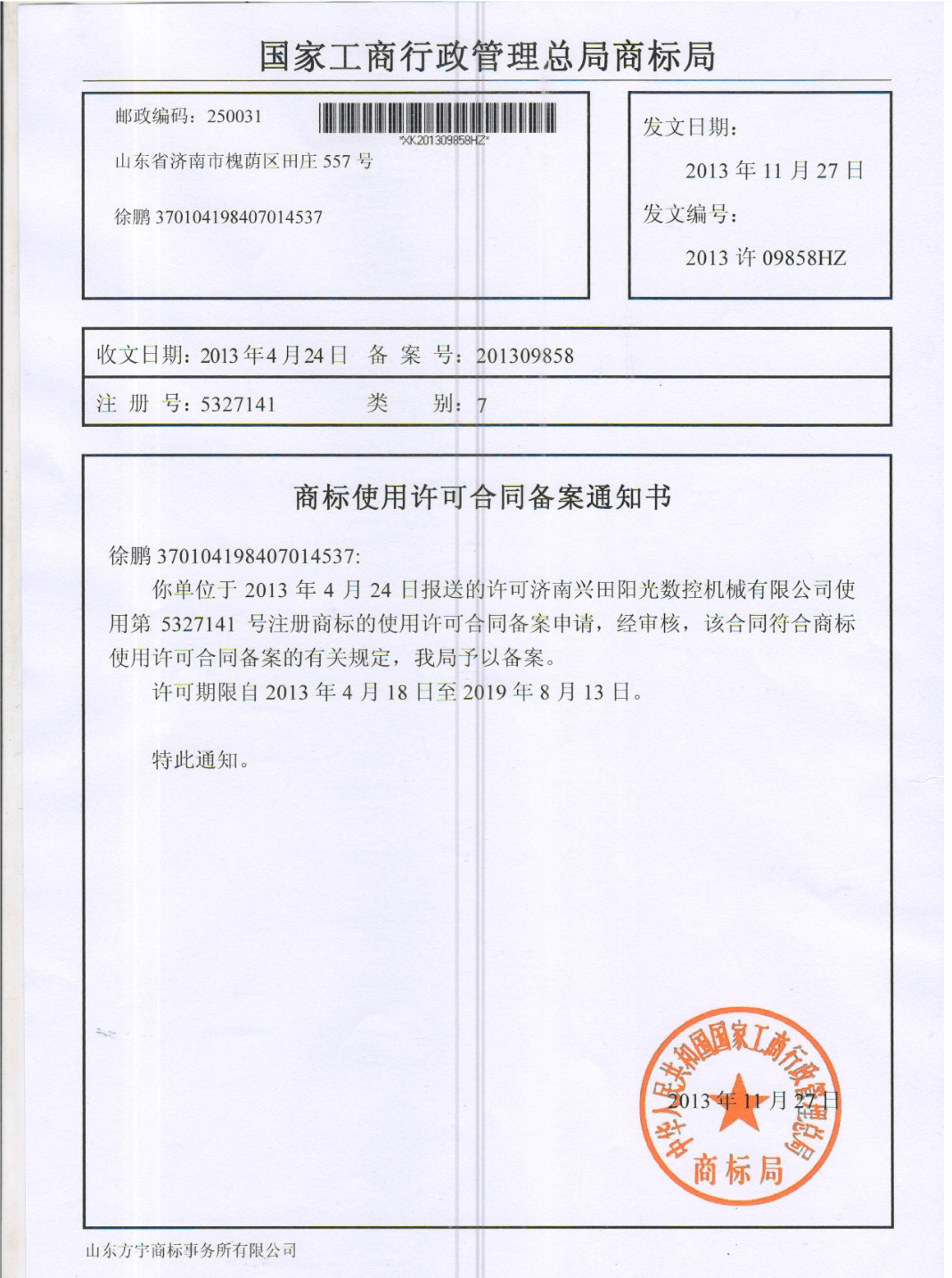 商標(biāo)使用許可合同備案通知書(shū)