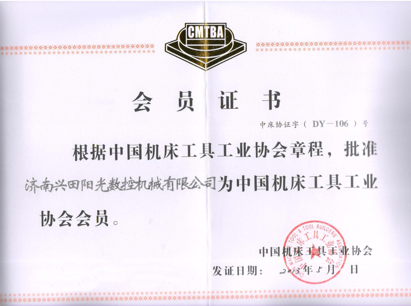 中國(guó)機(jī)床工具工業(yè)協(xié)會(huì)會(huì)員證書(shū)